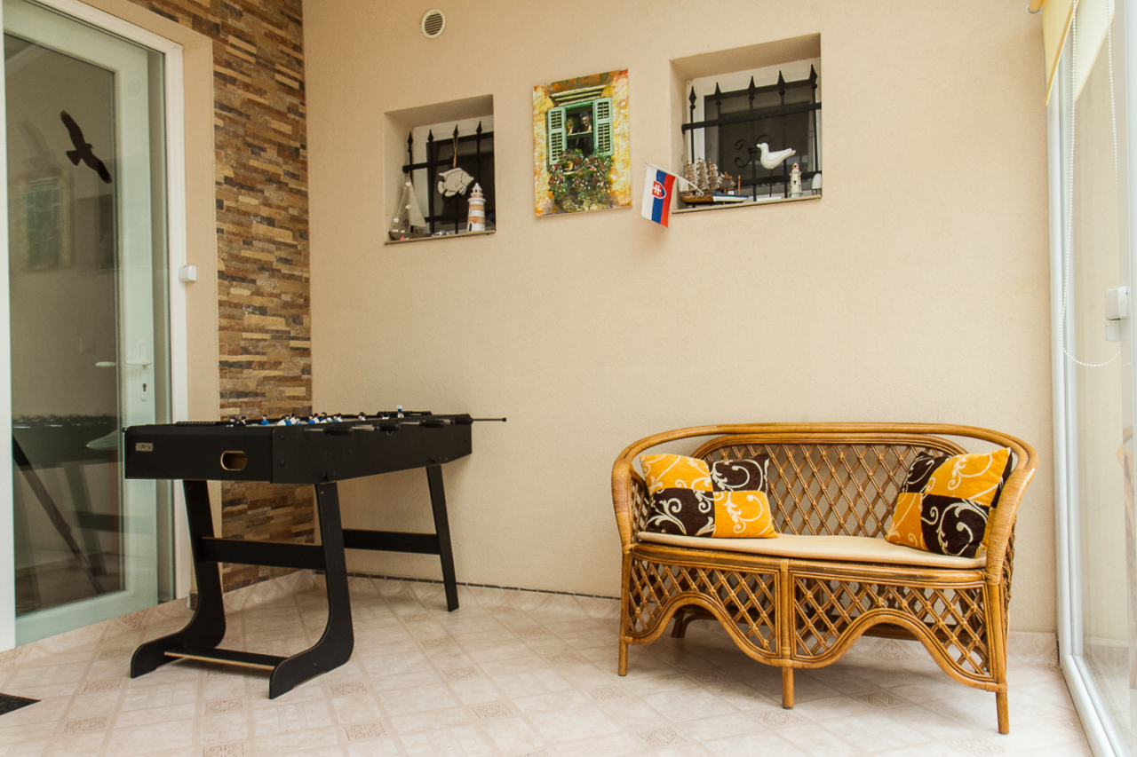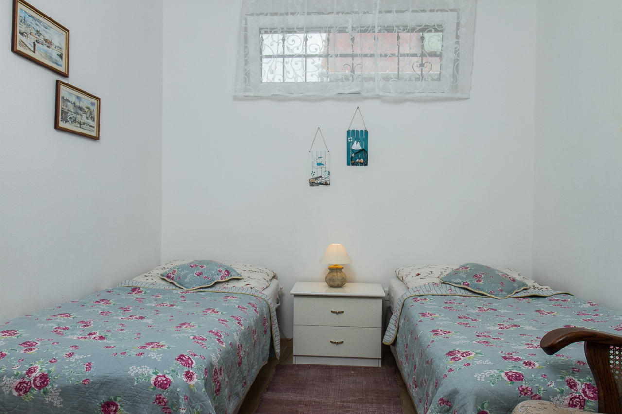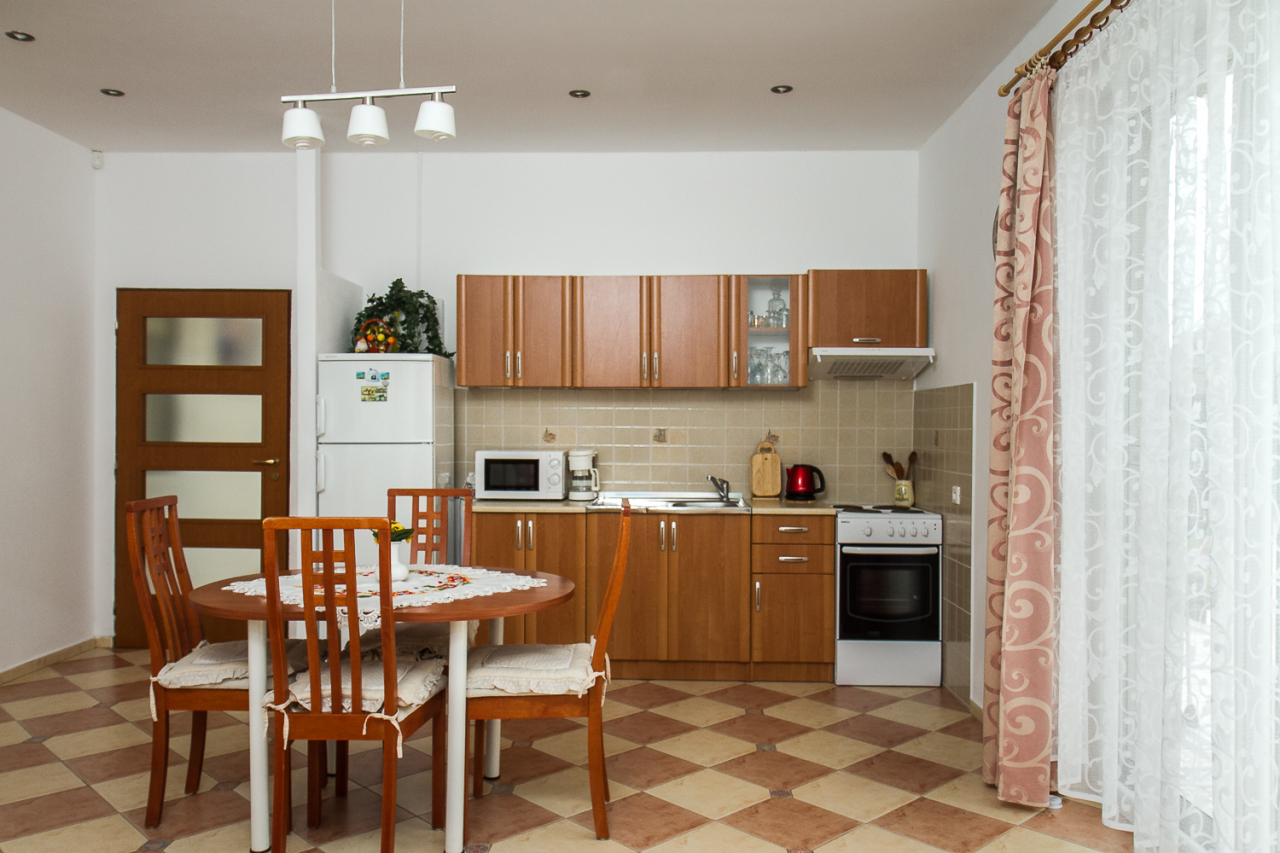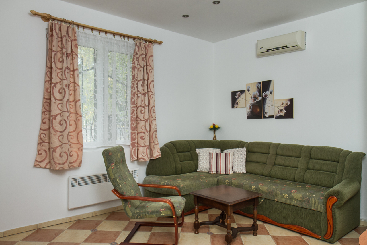 Szépen berendezett, klimatizált ikernyaraló fele ( hátsó lakás ) 4 főre wifivel, mosógéppel strandközeli helyen. Közös használatú kert, kerti bútor, kerti grill, hintaágy, napozóágyak, kerti pavilon, TV, autóbeálló, klíma. Az első lakás is foglalható BBO-034 kódszám alatt. Telek mögött fut a vasút.