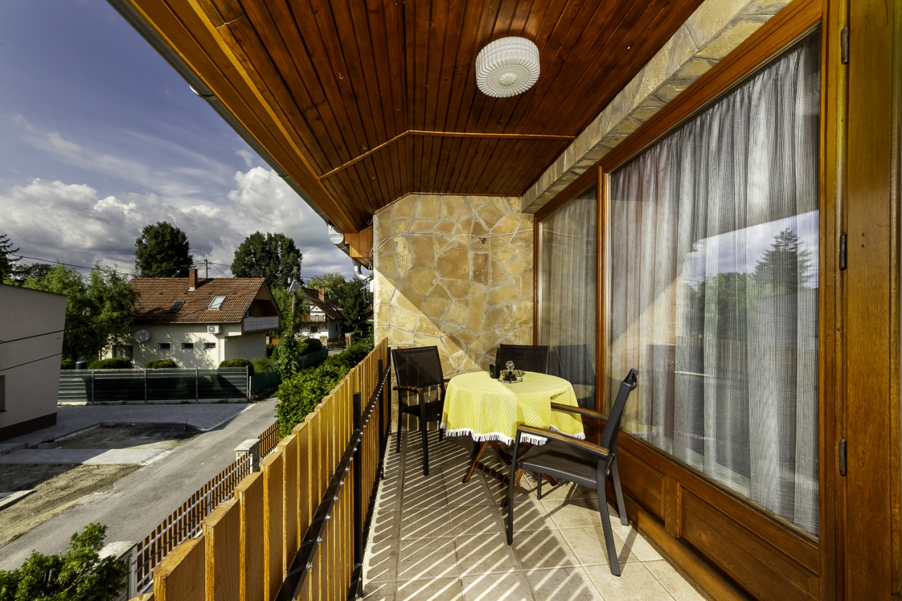Emelet: Nappali konyha- és étkezősarokkal, két kétágyas szoba, zuhanyzó/WC, WC, 2 erkély